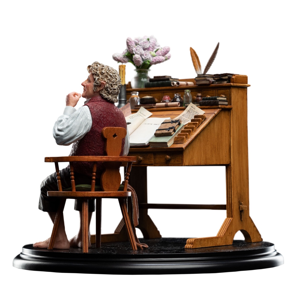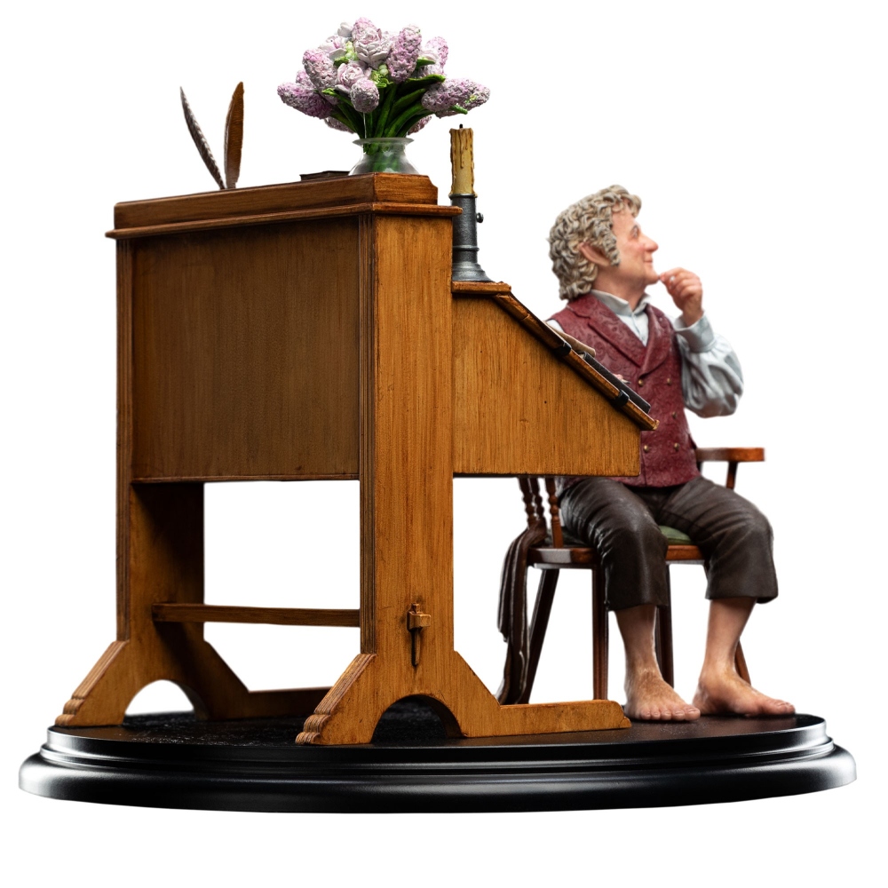 Данная сцена воспроизводит знаменитый момент из фильма, Бильбо Бэггинс, в утро своего сто одиннадцатого дня рождения сидит за своим рабочим столом, усердно записывая свои мемуары. Статуэтка передает образ почтенного хоббита, окруженного беспорядком из книг и рукописей, с пером в руке, в комфортной и теплой обстановке своего дома.