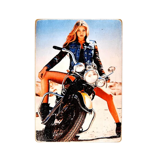 На этом постере изображен крутой черный байк в пустыне. На нем сидит красивая девушка в синей джинсовой куртке и черных ботинках.