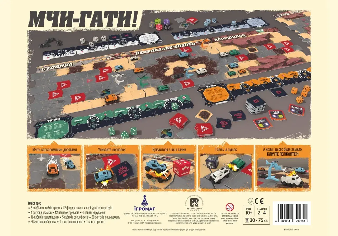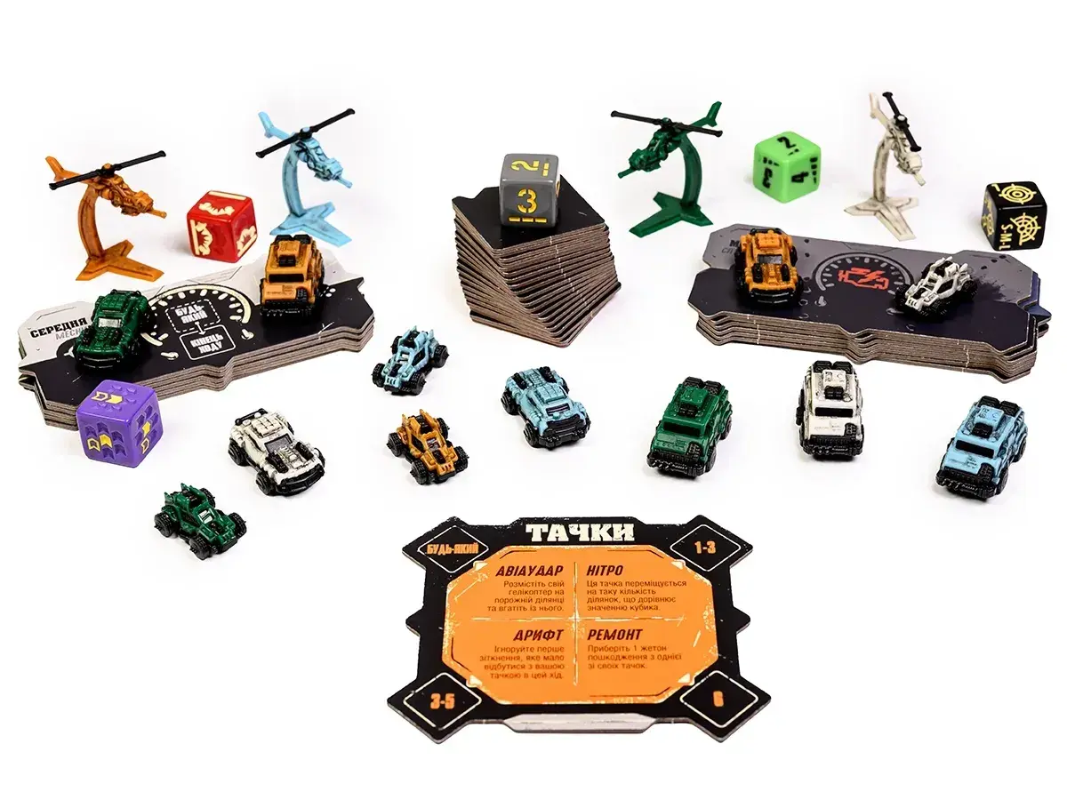 Ваше выживание зависит от хитрости и удачи: вертолеты кружат над дорогой, готовые к Авиаудару, а трасса полна препятствий и смертельных обрывов. Назначайте кубики своим машинам, чтобы определить их движение, и решайте, когда атаковать, а когда ремонтироваться.
