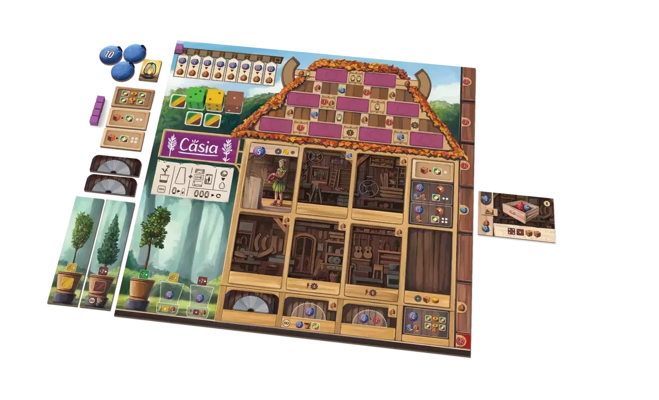 Ключевой механизм игры — управление игровыми кубиками, которые символизируют три различных сорта древесины. Вы будете склеивать, обрабатывать и даже выращивать эту древесину в горшках, где ее ценность растет с каждым раундом. При этом вам нужно тщательно выбирать плитки действий на общем поле: чем дольше действие не было выбрано, тем больше бонусов оно принесет, но ваши соперники могут воспользоваться вашим выбором.
