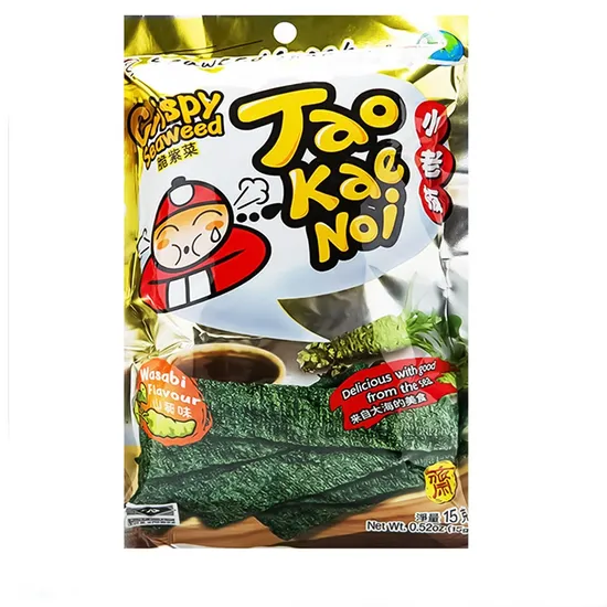 Хрумкі норі зі смаком васабі від ТМ TAOKAENOI - ідеальна закуска для любителів гострих смаків. Ніжні листи морської капусти, обсмажені до хрумкого стану, з додаванням пікантного аромату васабі. Спробуйте та насолоджуйтесь японськими частуваннями прямо у себе вдома!