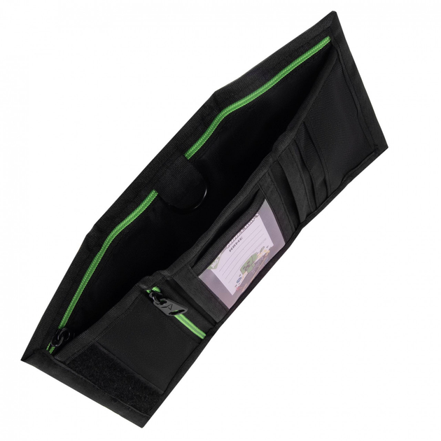 Изготовлен из прочного полиэстра с качественной фурнитурой, кошелек имеет просторное основное отделение на молнии, внешний и внутренний карманы на молниях, три отдельных отделения для мелочей, металлическое полукольцо для ключей и прозрачный карман для данных владельца.