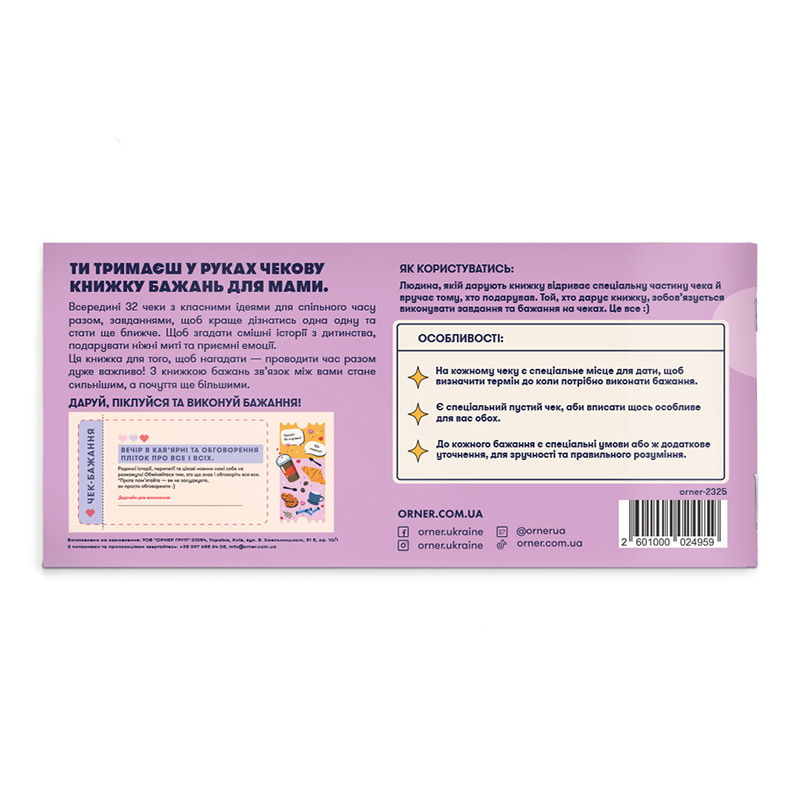 Чековая книжка желаний для мамы - это уникальный подарок, который позволит вашей любимой маме исполнить 32 своих самых заветных желания. Каждый чек представляет собой возможность получить заслуженное внимание и заботу от близких. Подарите ей возможность выбрать то, что она действительно хочет!