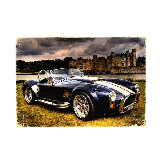 На этом постере изображена черная ретро машина без крыши. Она стоит на красивой зеленой траве, на фоне озера и старинного замка. Небо затягивается тучами. Сзади виднеется дремучий лес. Такой постер идеально подойдет для любителей ретро стиля, машин, замков, природы и старинных картин.