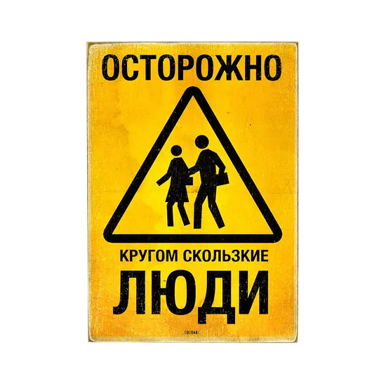 На постере изображен дорожный знак с людьми. Сам он желтого цвета. И надпись с предупреждением о "скользких людях". Такой постер идеально подойдет для настоящих ценителей приколов.
