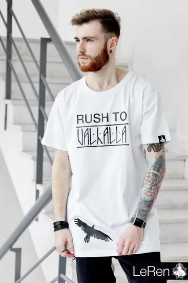 • Удлиненная белая футболка с призывом "RUSH to VALHALLA" - решительность, мужественность и целеустремленность расправленных крыльев и крепкого духа