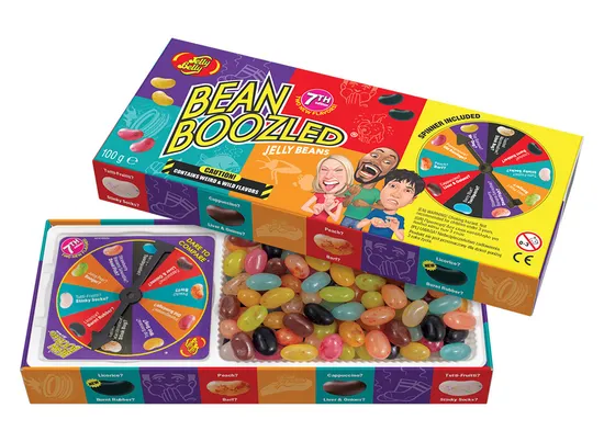Ця 7-а версія BeanBoozled є спеціальною пропозицією і включає 145 грам желейних бобів, а також фірмовий спіннер. Просто крутіть стрілку, і доля вкаже вам біб, який ви повинні з'їсти. Але будьте обережні! Ви ніколи не знаєте напевно, чи трапиться вам соковитий персик або огидна блювотина, солодка карамель або смердючі шкарпетки, смачний попкорн з олією чи яйце!